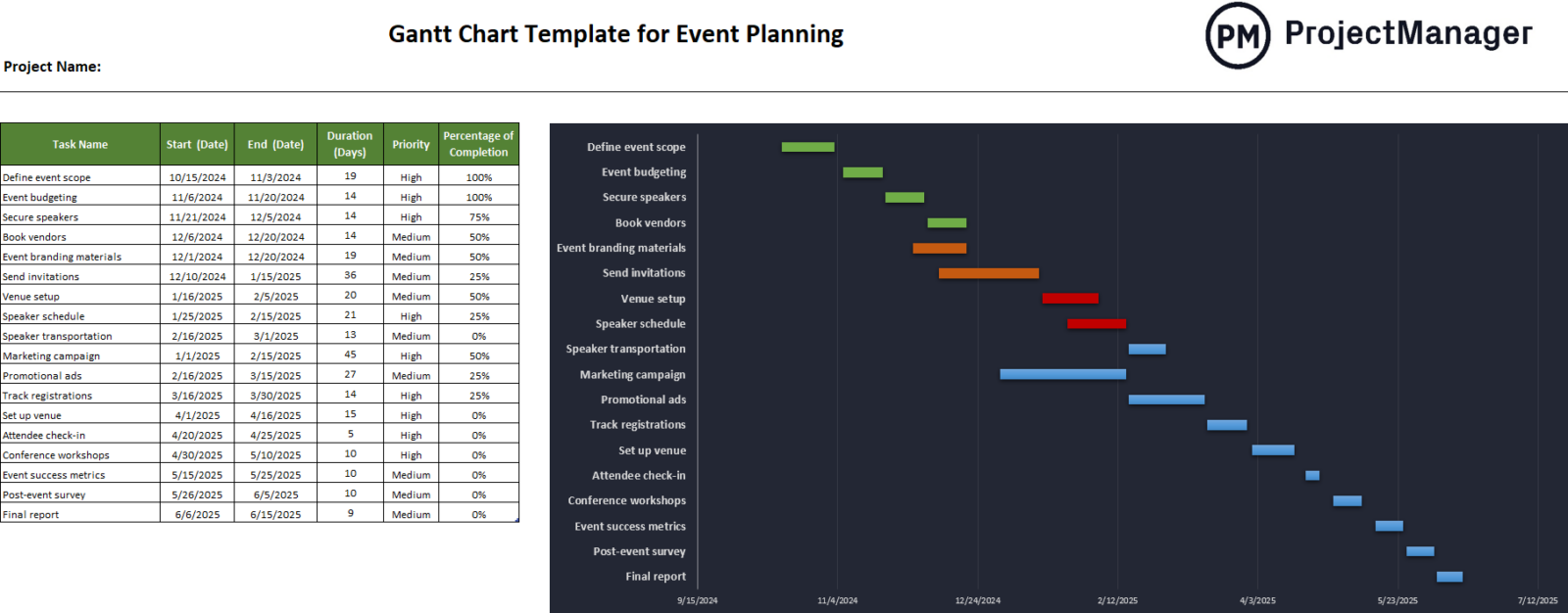 ProjectManager is cloud-based project and portfolio management software that has robust Gantt charts that do what templates do and so much more. Plans can also be shared with the event team, who can execute their work on kanban boards or task lists, depending on their preference. The calendar view is great to keep stakeholders updated on progress. Get started with ProjectManager today for free.