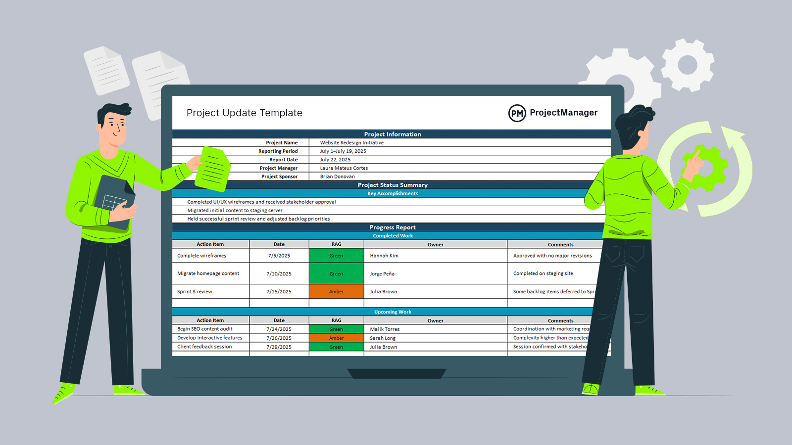 A project update template also improves accountability and alignment. By regularly filling out the same sections—such as milestones achieved, upcoming deadlines and risks—teams can identify trends, track progress over time and ensure that nothing falls through the cracks. It’s a simple yet effective way to keep everyone informed and focused on the most important project outcomes.