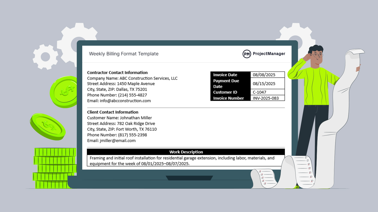 A weekly billing format is ideal when projects require frequent invoicing to maintain steady cash flow and ensure timely payment for work performed. It’s especially useful for short-term contracts, ongoing service agreements or projects with rapidly changing requirements where tasks are completed and approved in quick succession.