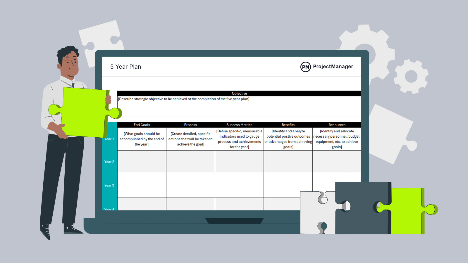 The 5-year plan template helps with monitoring and making adjustments as needed, by having success metrics to ensure that the execution of the plan is meeting expectations. However, a static template isn’t the best tool for monitoring and controlling a plan once it’s been executed. To ensure that the 5-year plan succeeds, open it in ProjectManager.