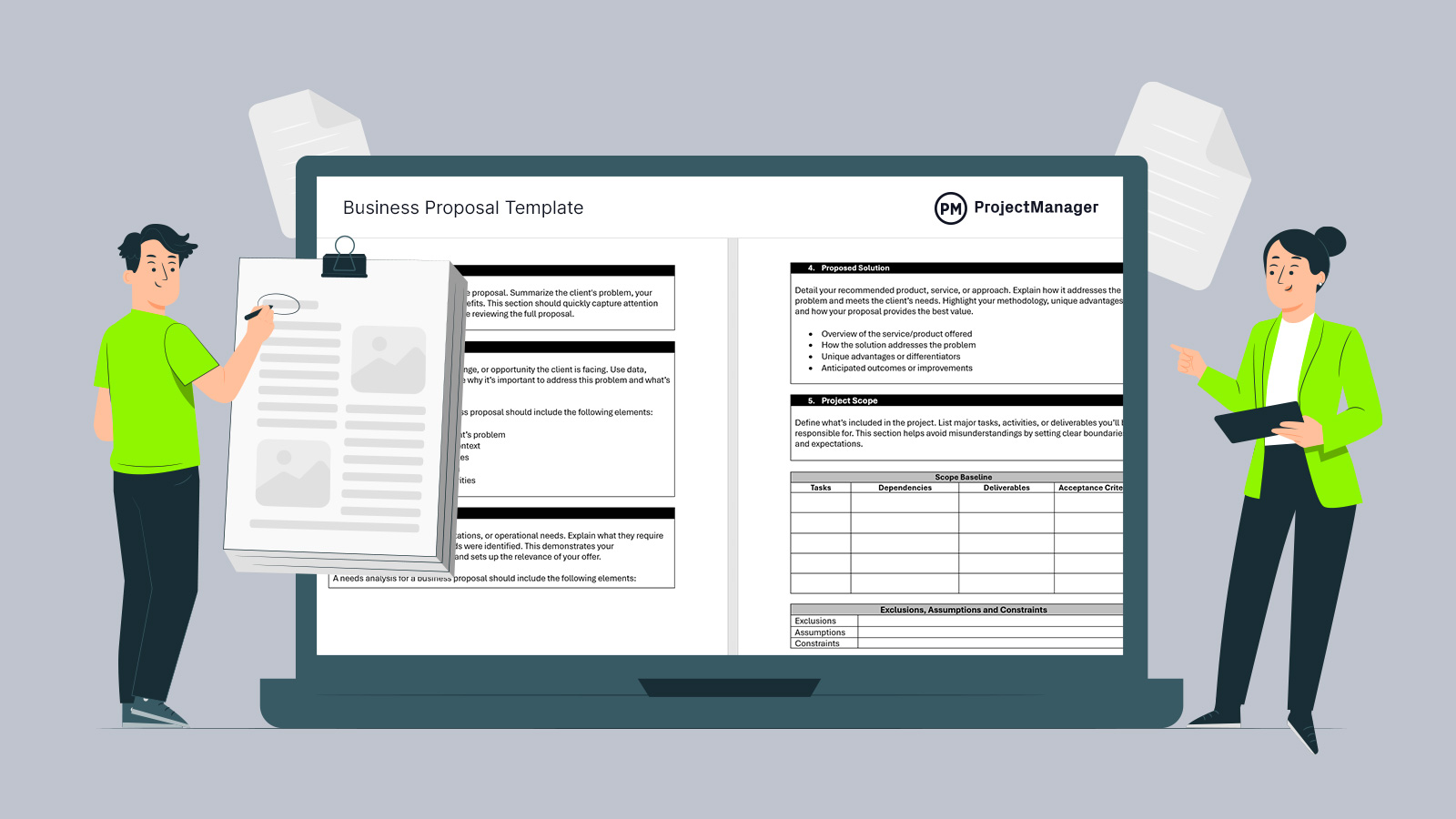 ProjectManager is award-winning project and portfolio management software with robust Gantt charts that can turn a business proposal template into a project schedule, complete with tasks, resources and costs. Then, leverage our other project views to oversee and execute the schedule.